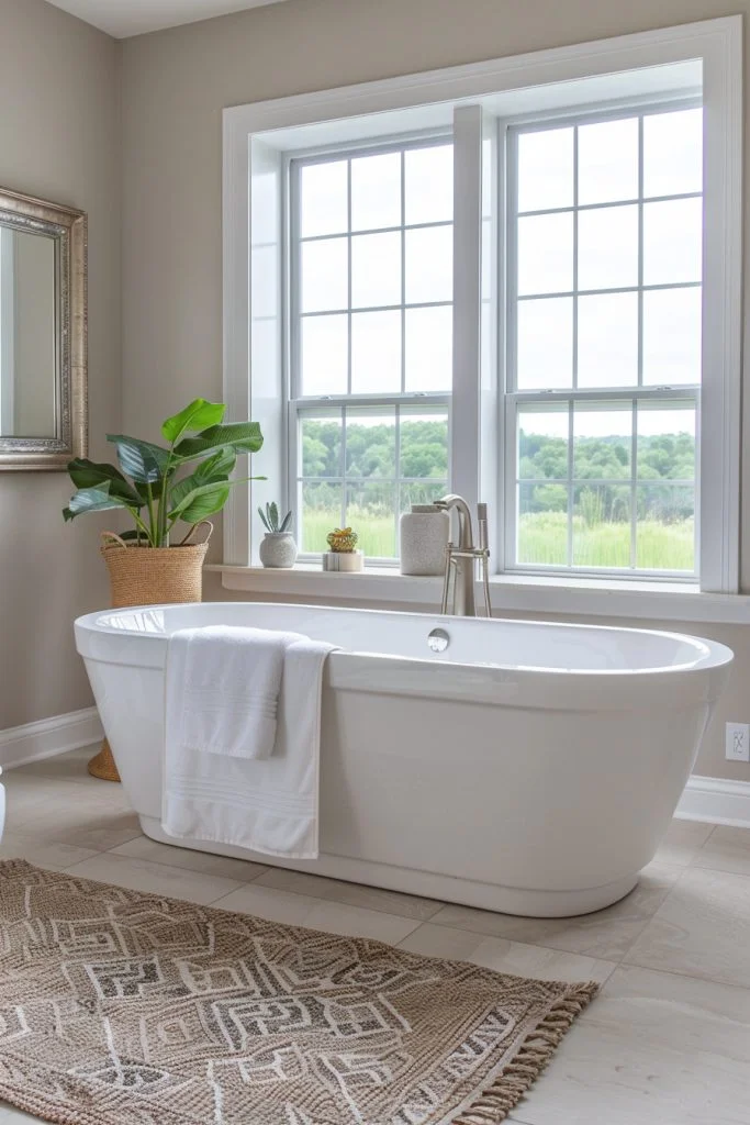 Designed to be a peaceful sanctuary, the Tranquil Afrohemian Escape focuses on stress reduction through design. Soft, muted tones like beige, sand, and sage green combined with minimalist decor create a Zen-like atmosphere. Simple, handcrafted items—such as a wooden soap dish or a hand-woven laundry basket—add authenticity and warmth without clutter. Natural light is maximized to enhance tranquility. Subtle African motifs on towels or accessories maintain the Afrohemian theme without sacrificing the calm vibe, offering a perfect spot for meditation and relaxation.