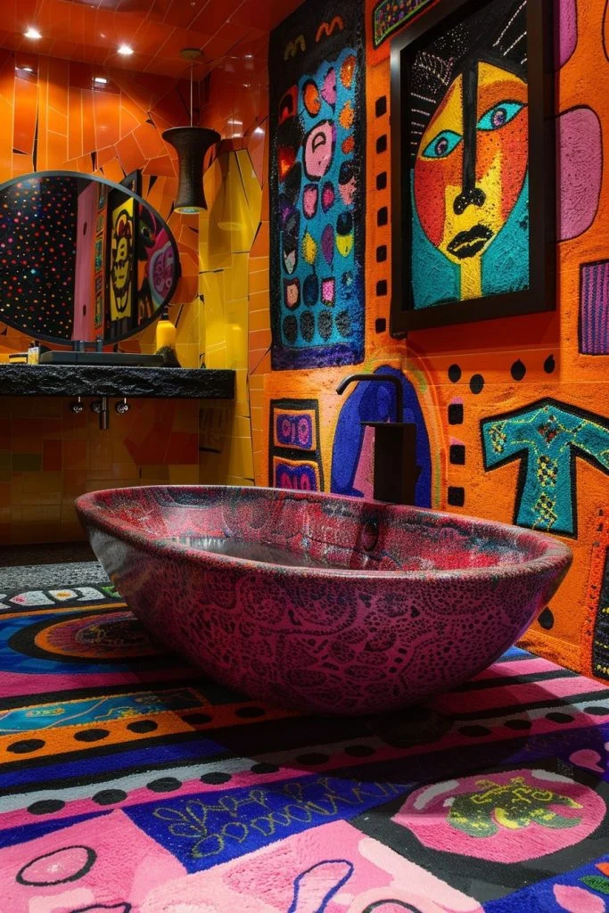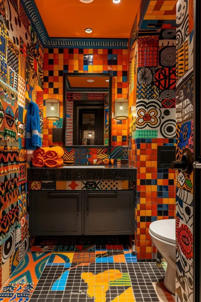 Colorful Afrohemian Expression is vibrant and expressive, featuring a kaleidoscope of colors that reflect the diverse cultures of Africa. Using colorful mosaic tiles, painted vanity units, and bright textiles brings the room to life. This bathroom is a joyous celebration of color and creativity, ideal for sparking joy. It is perfect for those who love a space that is both functional and artistically stimulating, proving that bathrooms don’t have to be boring.