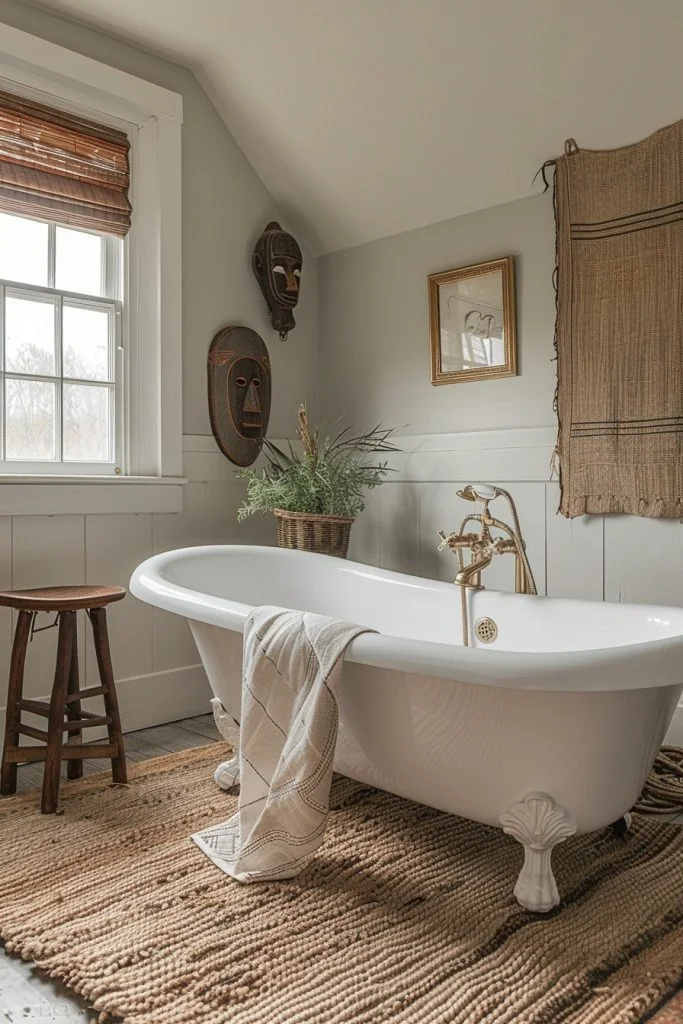 The Artistic Afrohemian Gallery doubles as a showcase for African art and craftsmanship. Displaying striking sculptures, vibrant paintings, and intricate crafts turns the bathroom into a cultural gallery. This space not only serves its functional purpose but also inspires and educates. Using neutral walls and floors as a backdrop lets the artwork stand out. This bathroom is perfect for art lovers and those who appreciate cultural beauty in every corner of their home, making even the most mundane routines feel inspiring.
