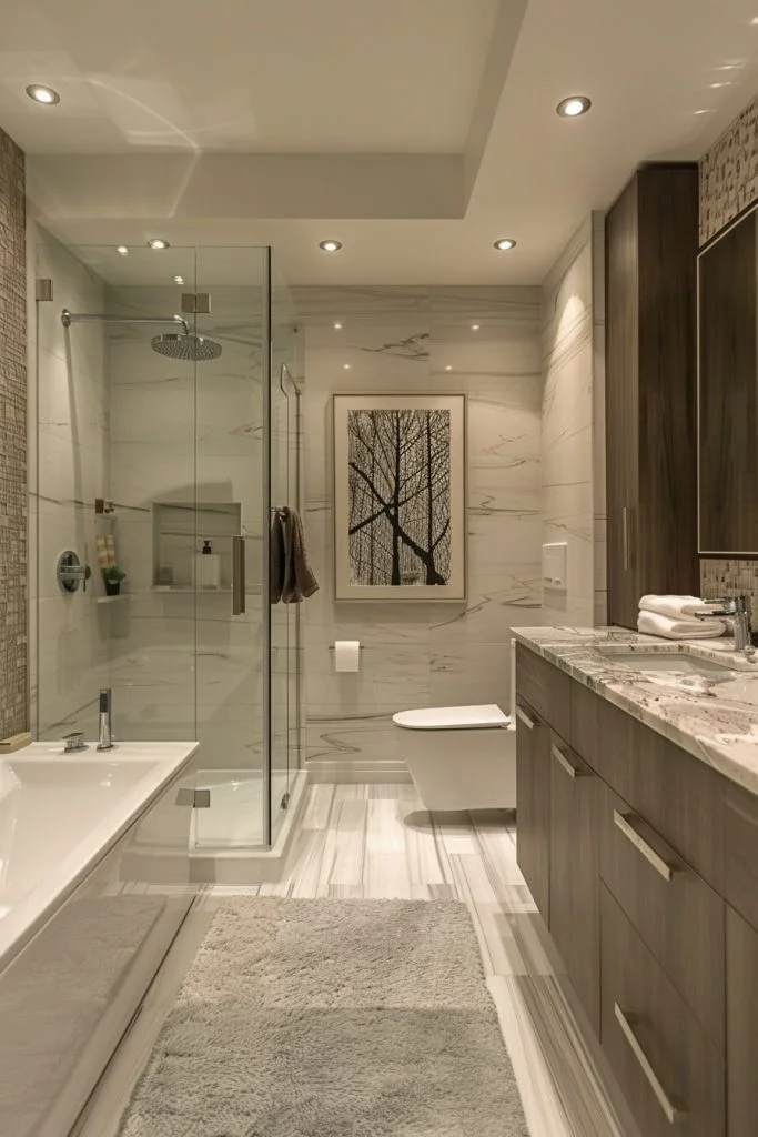 Modern Afrohemian Elegance marries sleek, contemporary design with subtle African influences for a sophisticated result. Think clean architectural lines and high-end materials like marble or glass, accented with African-inspired textiles for curtains or rugs. This style is perfect for those who desire a chic, culturally enriched bathroom that fits within a modern home. Keeping the color scheme neutral—whites, grays, and blacks—with occasional pops of color from art or accessories creates a timeless space that feels both current and deeply rooted in heritage.
