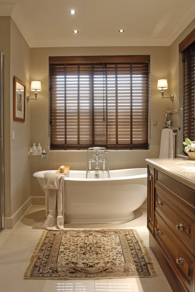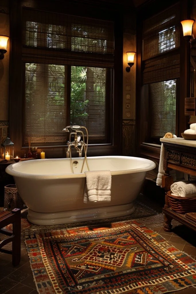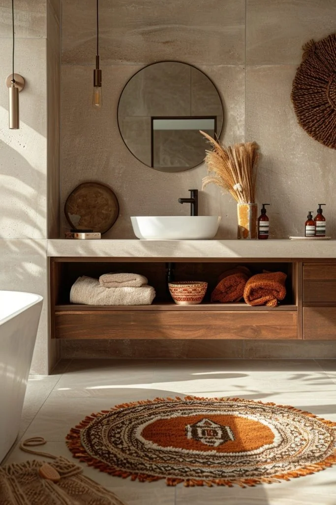 Warm Afrohemian Glow uses lighting and rich earth tones to create a cozy, womb-like atmosphere. Integrating wooden elements, copper fixtures, and clay accents enhances the warmth of the space. This bathroom is perfect for long, relaxing baths at the end of the day. Incorporating soft fabrics and rugs adds comfort and luxury. It is ideal for those seeking a bathroom that serves as a warm, relaxing retreat from the cold or stress of the outside world.