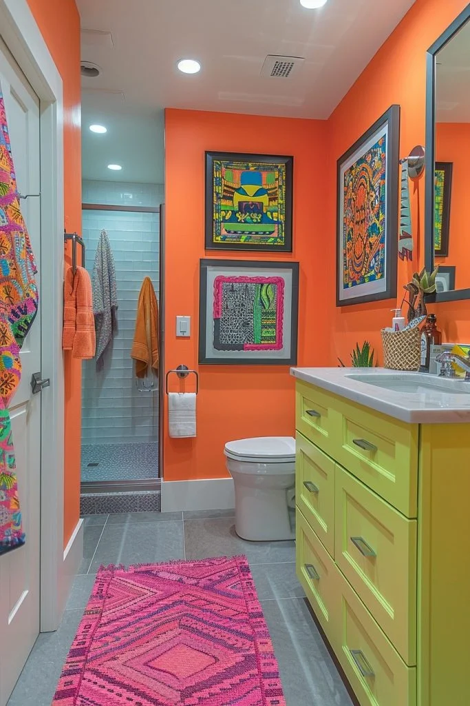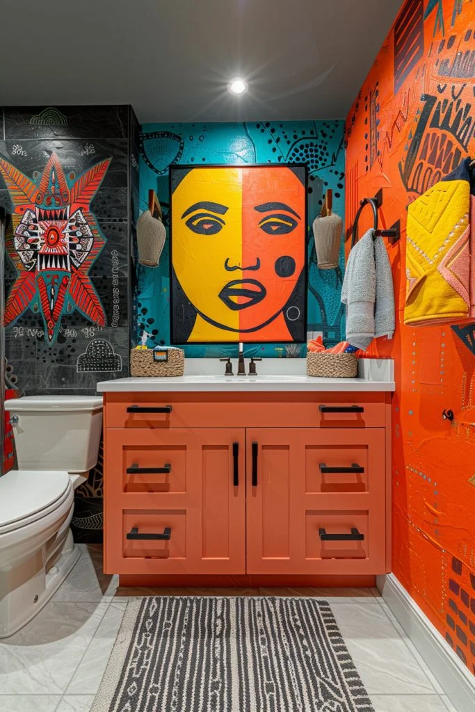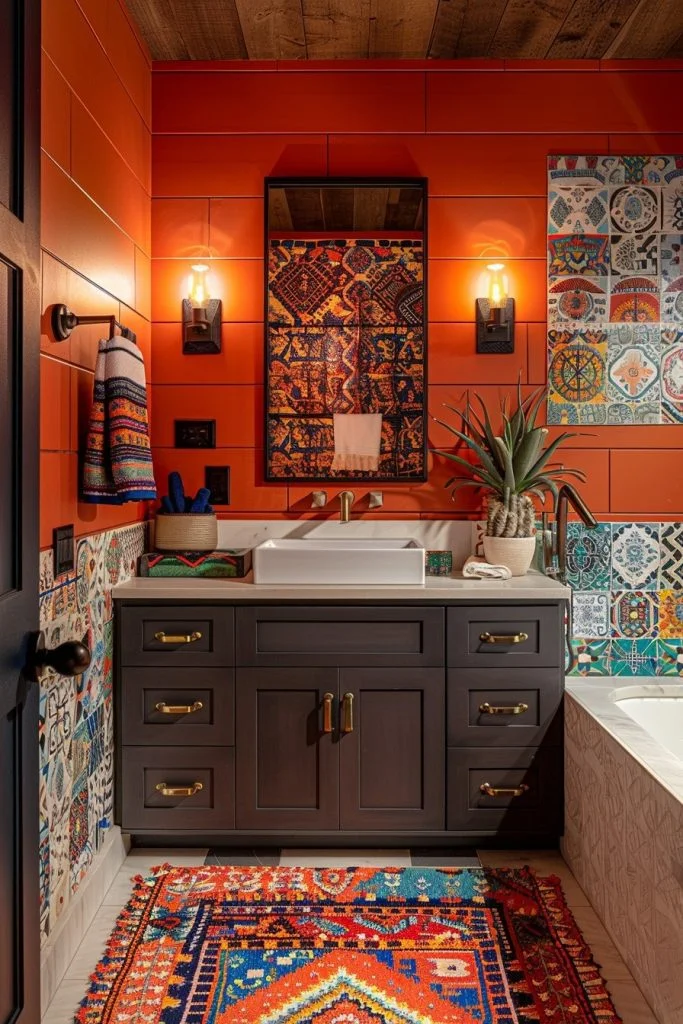 The Vibrant Afrohemian Color Splash is a celebration of joy and expressive design. Brightly colored tiles in shades of turquoise, orange, and yellow pair with vibrant bath linens and lively wall art to make this bathroom a cheerful space. It is ideal for those who want a room that instantly boosts their mood and creativity. Using a variety of textures and hues keeps visual interest high, ensuring the space feels dynamic. The splash of colors not only decorates the room but invigorates the senses, making morning routines more energetic.
