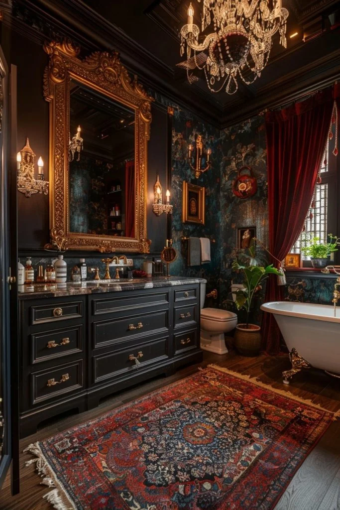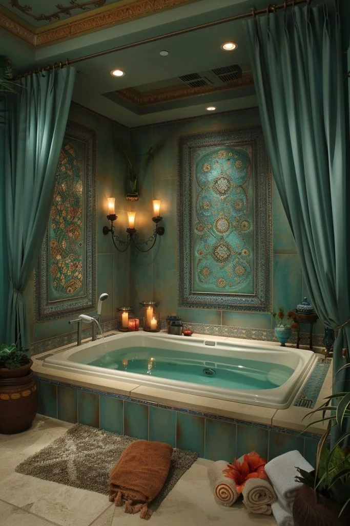 The Opulent Afrohemian Enclave features luxurious finishes and rich textures that command attention. Gold fixtures, ornate mirrors, and plush velvet curtains lend a sense of opulence, while African-inspired artwork provides cultural depth. This bathroom is designed for those who love a lavish space that feels curated and expensive. Soft lighting and deep colors like emerald or burgundy create an inviting and majestic atmosphere. It is ideal for anyone seeking a luxurious escape with a strong sense of identity and history.
