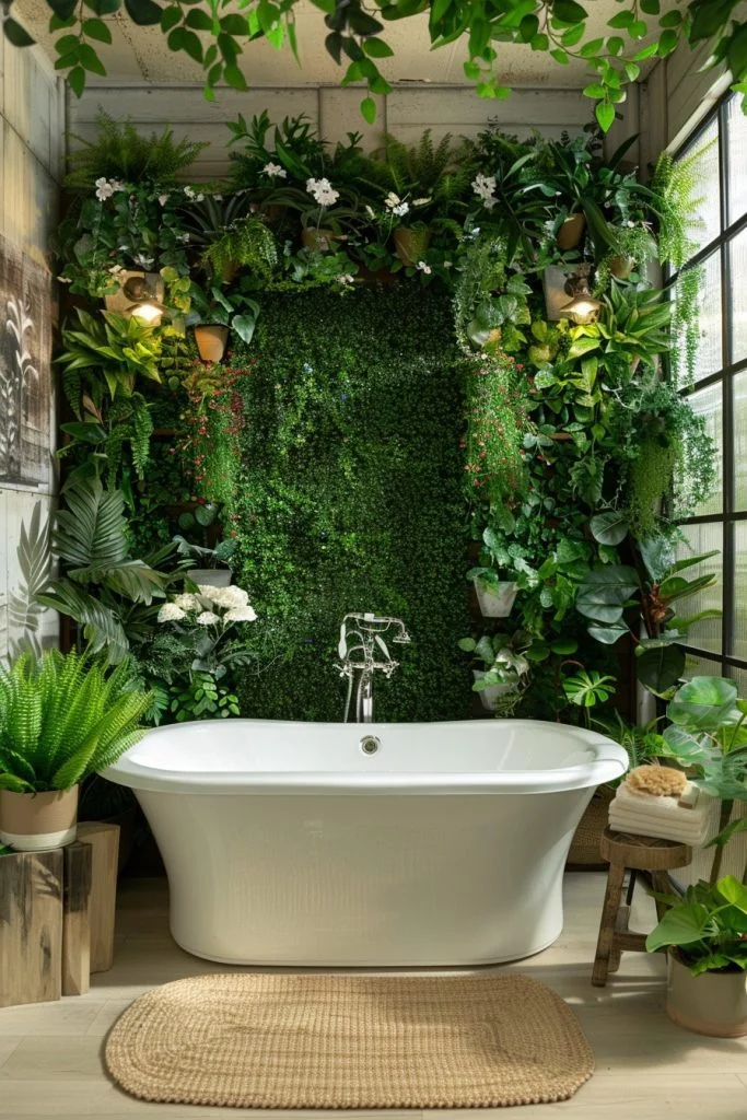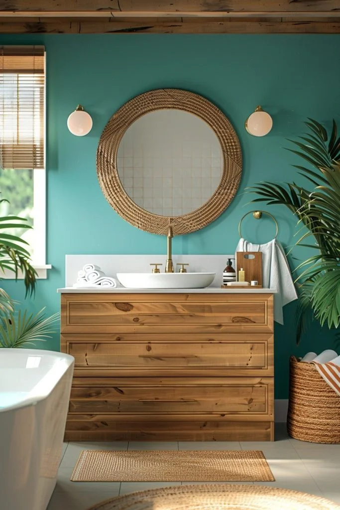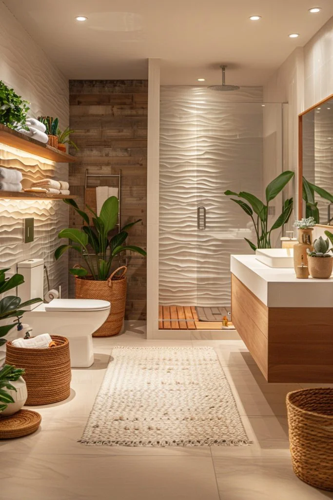 Imagine stepping into a serene jungle every time you enter your bathroom. The Tropical Afrohemian Oasis combines lush, air-purifying plants like ferns and monstera with vibrant African textiles to create a lively atmosphere. Natural materials such as bamboo shelving and rattan baskets enhance the tropical feel, grounding the space in nature. Colorful towels featuring tribal prints add a splash of charm and personality. This design concept is perfect for those who want a refreshing, spa-like environment that feels alive and breathing, offering a daily escape to paradise.