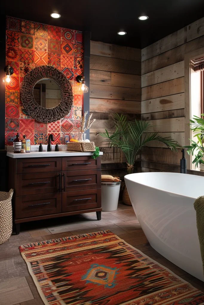 The Eclectic Afrohemian Retreat is all about storytelling through diverse elements. This style encourages you to mix various textures and eras to create a unique, personalized space. Combine traditional woven African baskets for storage with modern metallic faucets for an interesting contrast. Colorful mosaic tiles that reflect Afrohemian artistry can sit alongside contemporary sanitary ware. This bathroom is ideal for collectors and travelers who want their space to reflect a journey, ensuring there are plenty of art pieces and cultural artifacts to highlight the theme.