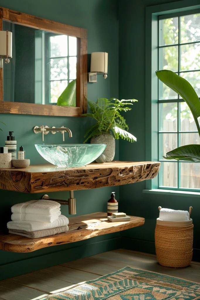 Embrace the vitality of nature with the Lush Green Afrohemian Sanctuary. Wall-mounted planters, hanging vines, and terrariums introduce a refreshing touch of the outdoors, while earth-toned tiles and wooden accents reinforce the organic feel. This space is designed to mimic the tranquility of a forest retreat, making it ideal for rejuvenation. Subtle African prints can be incorporated through textiles, blending seamlessly with the greenery. It is a perfect setting for those who want a bathroom that serves as a personal, breathing oasis.