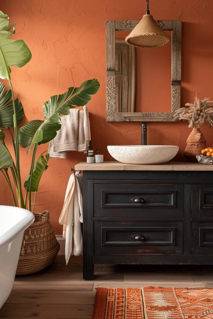Bohemian African Dreams merges bohemian freedom with African tradition. Layering textures and patterns creates a casual, free-spirited space that encourages relaxation and imagination. Using hanging plants, woven baskets, and soft, flowing fabrics enhances the bohemian feel. This bathroom is a dreamy escape for those who value creativity and comfort above strict design rules. It is perfect for daydreamers and creative souls who want a personalized space.