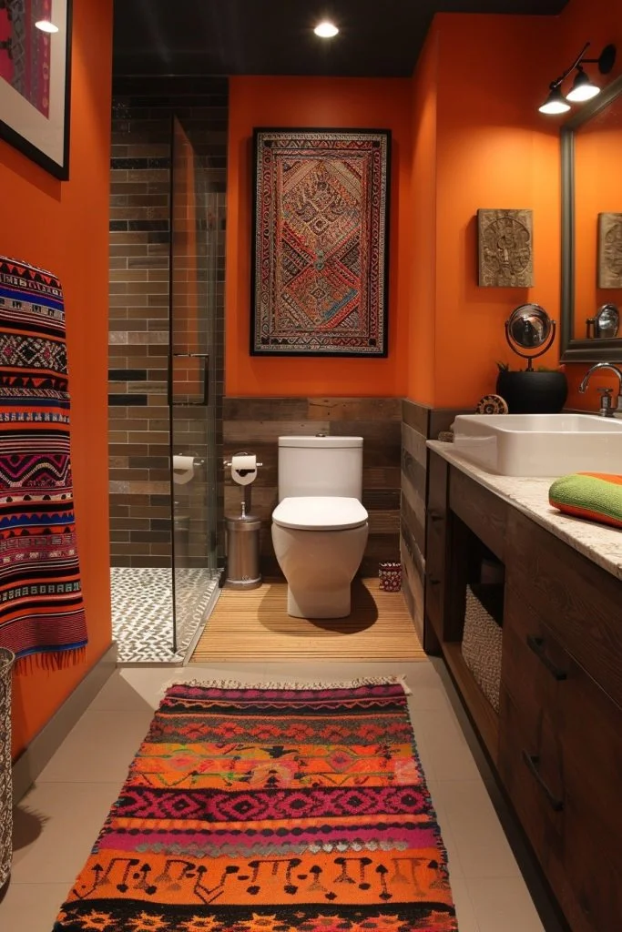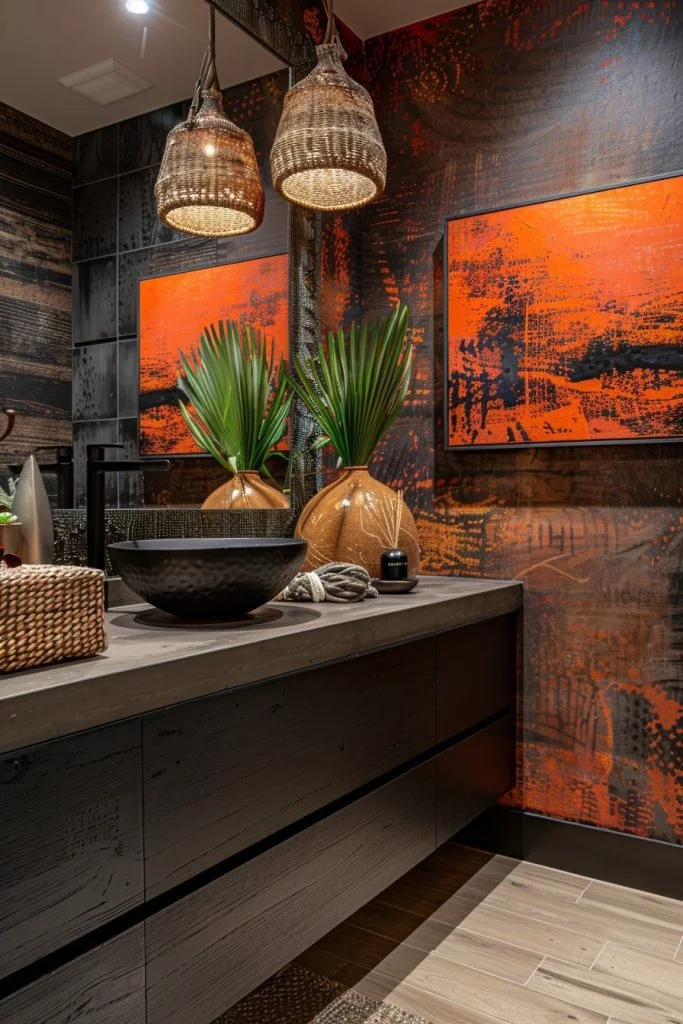 Urban Afrohemian Chic combines the edge of city living with the soul of African design. Think sleek black fixtures, high-contrast subway tiles, and geometric patterns inspired by African art. This bathroom is perfect for apartment dwellers who want to celebrate cultural elements within a modern urban context. The layout remains streamlined and functional, with bold decorative pieces—like a large tribal mask or a statement mirror—serving as focal points. This setup is ideal for those who appreciate a chic, cultured bathroom that feels sophisticated and metropolitan.