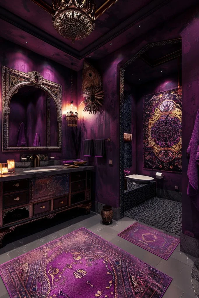 Regal Afrohemian Majesty is characterized by grandeur and royal touches. Deep purples, royal blues, and luxurious golds dominate the color palette, while plush fabrics and elegant accessories add to the atmosphere. This space is for those who wish to bathe in luxury while surrounded by rich cultural heritage. Incorporate ornate mirrors and sumptuous towels to enhance the majestic feel. It is perfect for anyone looking to create a bathroom that feels like a private palace chamber.