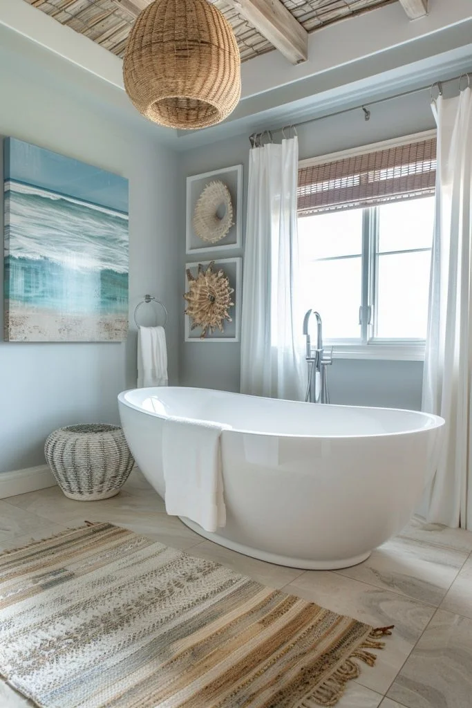 Coastal Afrohemian Breeze captures the light and airy feel of the coast, blended with African charm. Shades of blue and white evoke the sea and sky, complemented by sandy tones for a beach-like atmosphere. Decorating with seashells and driftwood alongside African prints and fabrics creates a unique fusion. This bathroom is perfect for those who love the relaxed feel of the coast with a cultural twist, offering a refreshing escape from the everyday.