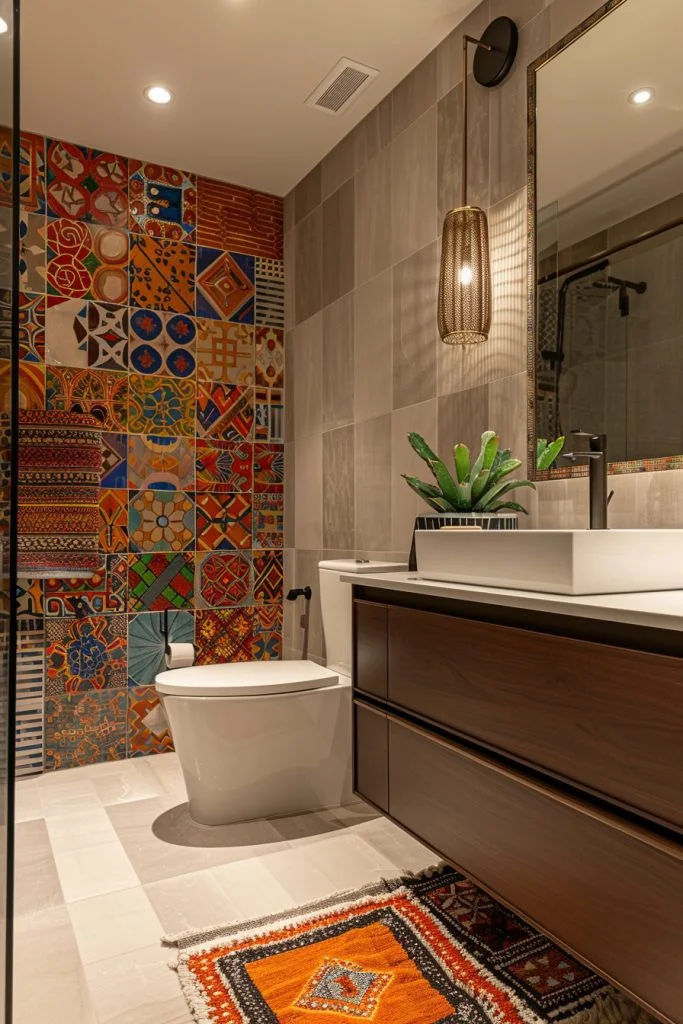 Sleek Afrohemian Lines combine clean, modern architecture with decorative African elements. Streamlined cabinetry and frameless glass showers are paired with vibrant, geometric-patterned tiles or textiles to add warmth. This design appeals to those who prefer a contemporary aesthetic but want to avoid a sterile look. The minimalist approach ensures the space feels open and uncluttered, while the Afrohemian touches add personality. Using understated colors with bold accents maintains a perfect visual balance.