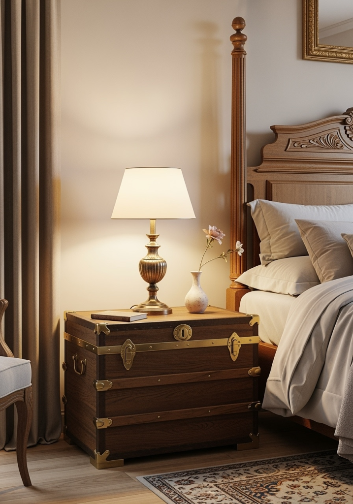For a truly unique and charming antique touch, use a beautifully preserved antique trunk as your bedside table. This piece instantly adds character, history, and a touch of wanderlust to the room. The trunk can be leather-bound, wooden with brass accents, or even a painted, distressed metal one. It provides hidden storage for books or personal items, and its flat surface is perfect for a classic lamp and a small vase of flowers. This simple repurposing brings a sense of adventure and timeless elegance, perfectly blending functionality with vintage appeal.