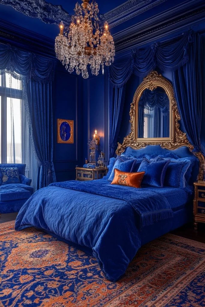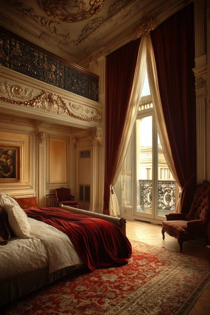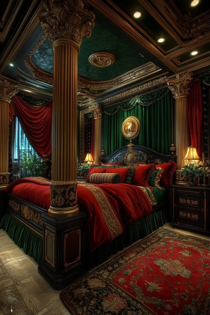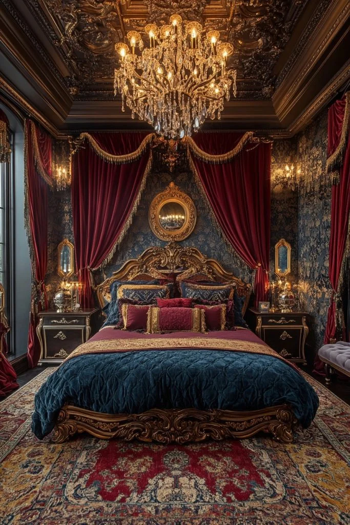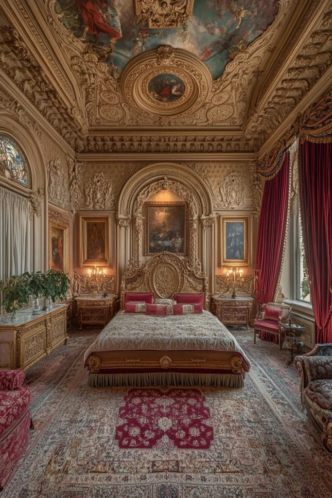 The Baroque Beauty Room is all about drama and grandeur, with bold, ornate details and a rich color scheme. Luxurious fabrics like damask and brocade cover the furniture and windows, while gilded accents on mirrors and picture frames add a sense of extravagance. Heavy, carved furniture pieces, often in dark wood, make a strong visual impact. Lush rugs and tapestries complete the lavish decor, creating a truly opulent and theatrical bedroom.