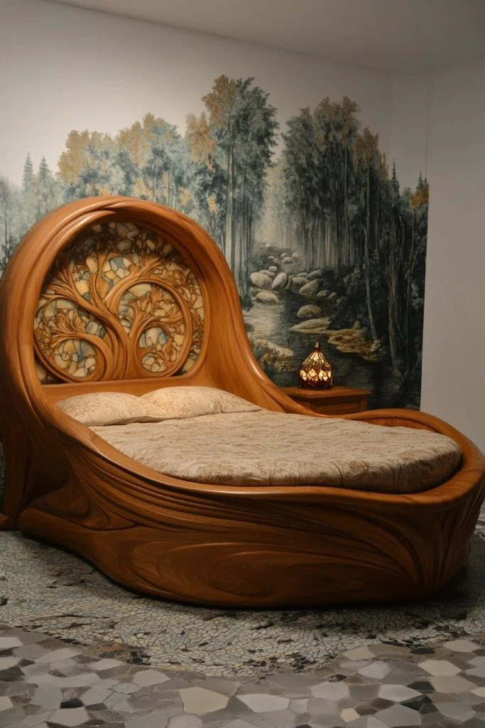 The Art Nouveau Nook incorporates the flowing lines and natural forms characteristic of the Art Nouveau period. Furniture in this style often features organic, “whiplash” curves and is made from materials like wrought iron and fine woods. Stained glass lamps or windows add a pop of color and intricate design. The overall decor is harmonious and integrated, with each element reflecting nature-inspired motifs, creating a unique and artistic atmosphere.