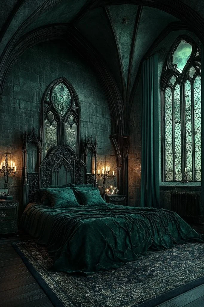 The Gothic Glam Bedroom combines the mystery and architectural beauty of Gothic style with luxurious modern touches. Expect pointed arches in the bed frame or windows, along with dark wood or metal furniture featuring intricate Gothic motifs. The color palette is typically dark—think blacks, deep purples, and burgundies—to enhance the dramatic effect. Stained glass elements and heavy fabrics contribute to the medieval yet chic feel, creating a space that is both dark and dazzling.