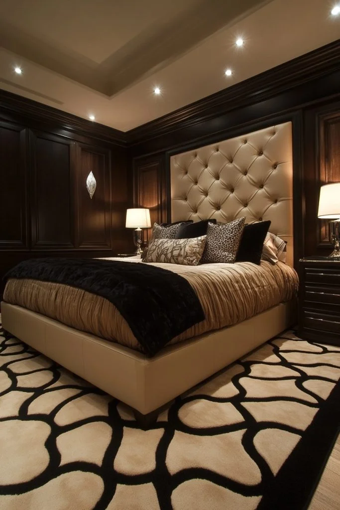 The Art Deco Delight bedroom features the bold geometric patterns and streamlined furniture of the Art Deco period. Glossy finishes, mirrored surfaces, and metallic accents in silver, chrome, or gold add a touch of glamour. The color palette tends to be stark, with a lot of blacks, whites, and vibrant accents like teal or red. Sunburst motifs or chevron patterns can add visual interest to the walls or textiles, creating a dynamic and sophisticated space.