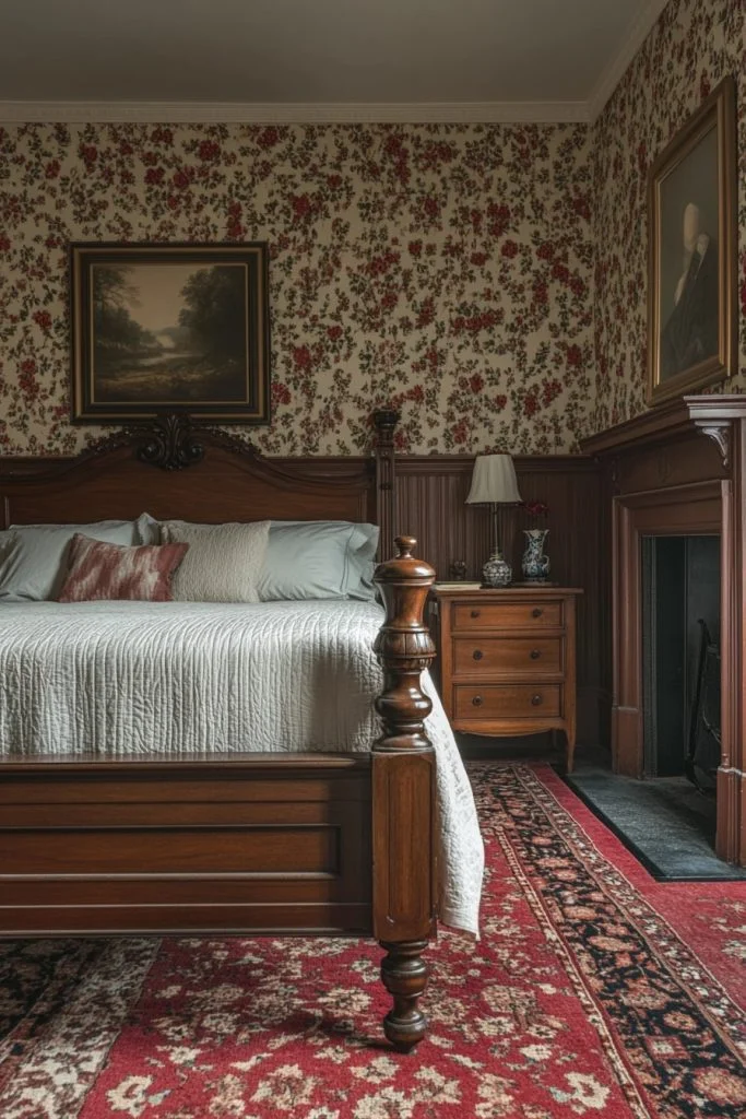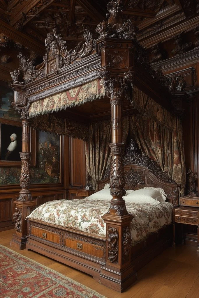 The Tudor Style Sanctuary draws on the rich, dark aesthetics of the Tudor period. Heavy oak furniture with detailed carvings and leaded glass details dominate the space. Deep reds and greens complement the dark wood, while wrought iron or bronze hardware adds rustic charm. Tapestries or heavy, embroidered fabrics are ideal for curtains and bedding, contributing to the stately, almost medieval atmosphere.