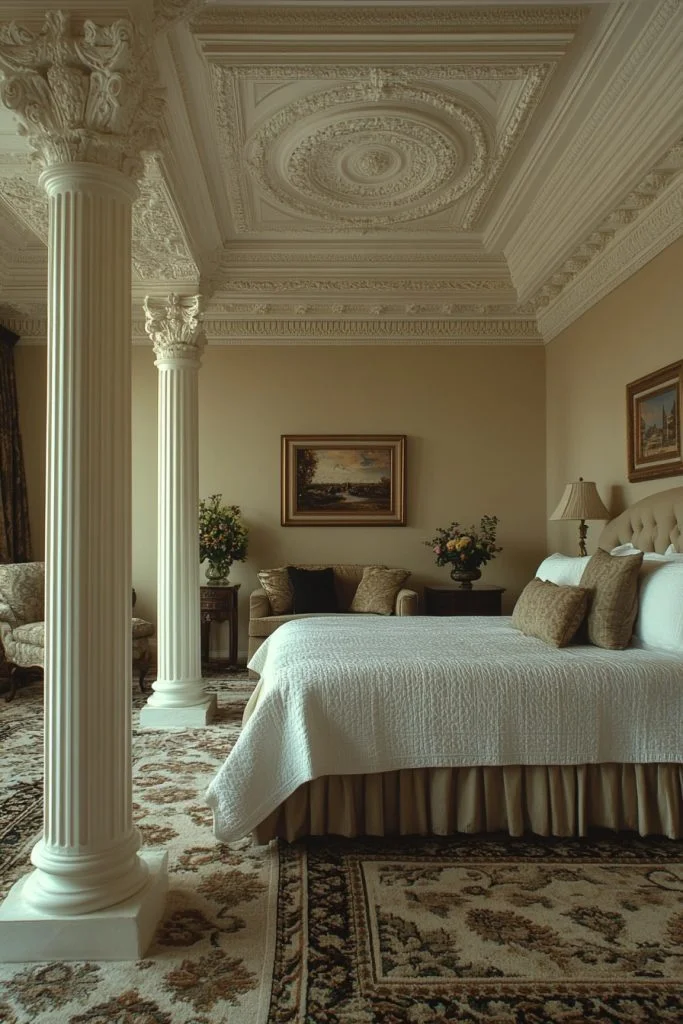 The Neoclassical Night Haven draws on the elegance and simplicity of ancient Greek and Roman designs. Furniture features clean lines and classical details like columns and pediments, often in light or painted wood. Soft, muted color palettes provide a backdrop for ornate gold accents and decorative motifs like laurel wreaths and medallions. Fabrics are luxurious yet understated, with silks and linens in soft pastels, creating a timeless and sophisticated sanctuary.