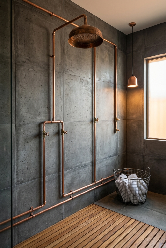One of the most defining features of industrial design is celebrating the “guts” of a building. Instead of hiding plumbing behind drywall, make it a focal point. An exposed pipe shower system, typically in copper or matte black, acts as a functional sculpture. The raw metal against a simple tiled or concrete wall creates an authentic, factory-like aesthetic. It adds instant character and a steampunk edge to the bathroom, proving that necessary elements can also be beautiful design statements.