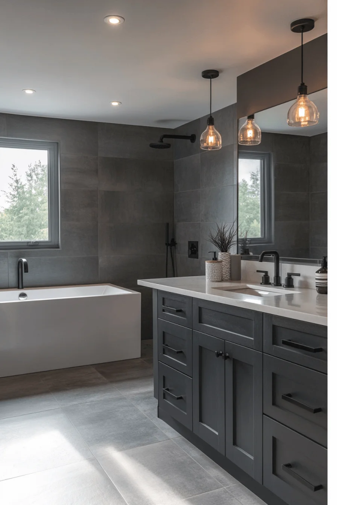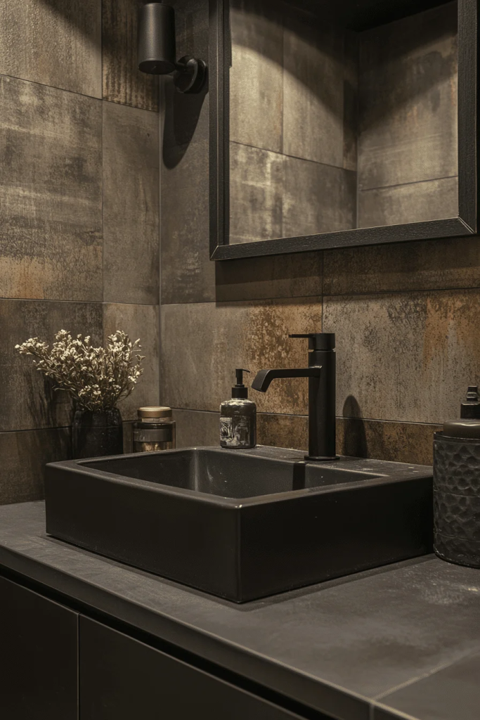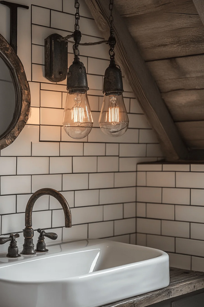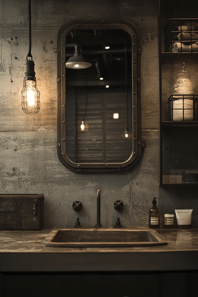 Ambient industrial lighting is crucial in creating the right atmosphere. Options like pendant lights with metal cages, Edison bulbs, or wall sconces with an aged bronze finish illuminate the space while adding style. The choice of warm lighting can soften the room’s feel, making it cozy despite the hard materials. This type of lighting is perfect for enhancing the bathroom’s mood.