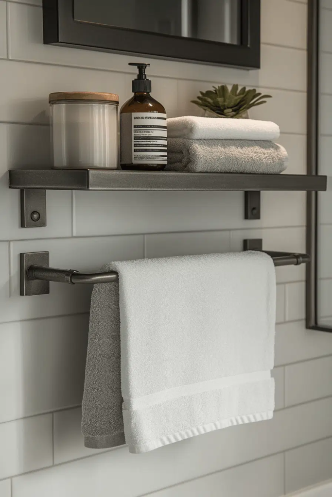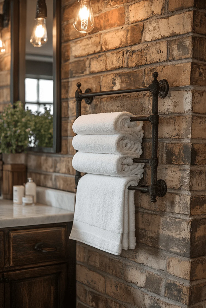 Weathered iron towel racks add a touch of rustic charm. Their distressed finish complements other industrial materials used throughout the bathroom, such as exposed brick or concrete. These racks are not only functional but also serve as decorative pieces that enhance the bathroom’s aesthetic. They are ideal for those who appreciate the beauty in aged materials and handcrafted details that look like they have a history.