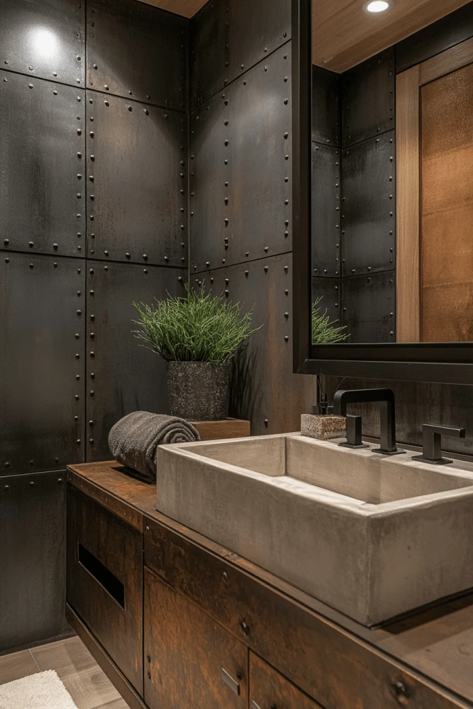 Riveted metal wall panels add an authentic industrial touch, bringing texture and historical depth to the design. These panels can serve as an accent feature behind the vanity or be used more extensively to reinforce the industrial theme. The visible rivets provide a handcrafted, aviation-inspired look. This bold design choice is ideal for making a strong visual statement.