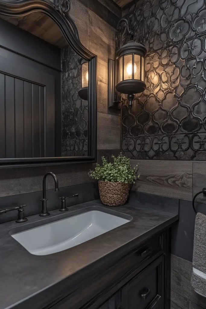 An edgy mirror with a metal frame is a functional and stylish addition. The frame can mimic or complement other metal elements in the room, such as fixtures and hardware. Look for frames made of iron, steel, or distressed brass. This type of mirror adds a raw, unfinished look that aligns with the industrial aesthetic while providing a necessary bathroom component.