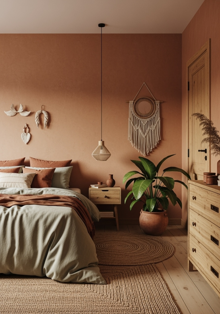 For a deeply grounding and inviting boho bedroom, embrace a palette that centers on warm terracotta and soft sage green. Paint the main walls a muted, earthy terracotta to create a cozy, sun-baked feel. Then, introduce sage green through textiles like a linen duvet cover, throw pillows, and even a large, leafy plant in a terracotta pot. Natural wood furniture, woven jute rugs, and ceramic decor pieces enhance the organic connection. This palette creates a harmonious blend of desert warmth and natural tranquility, making the space feel both vibrant and incredibly calm.
