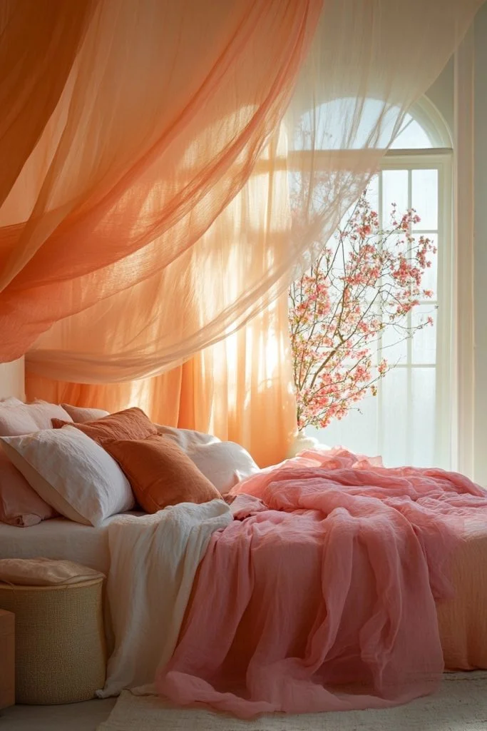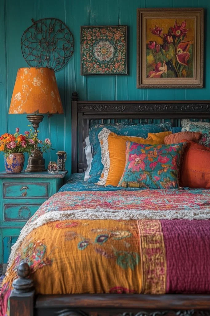 Moroccan Spice brings bold oranges and reds to the boho bedroom, evoking the vibrant energy of a Moroccan bazaar. This palette is perfect for creating a warm, inviting space that stimulates the senses. Rich, patterned textiles and ornate lanterns can enhance the Moroccan feel, while dark wood furniture provides a grounding element. Vibrant wall art or colorful tiles can add authentic Moroccan flair, making the room a feast for the eyes.