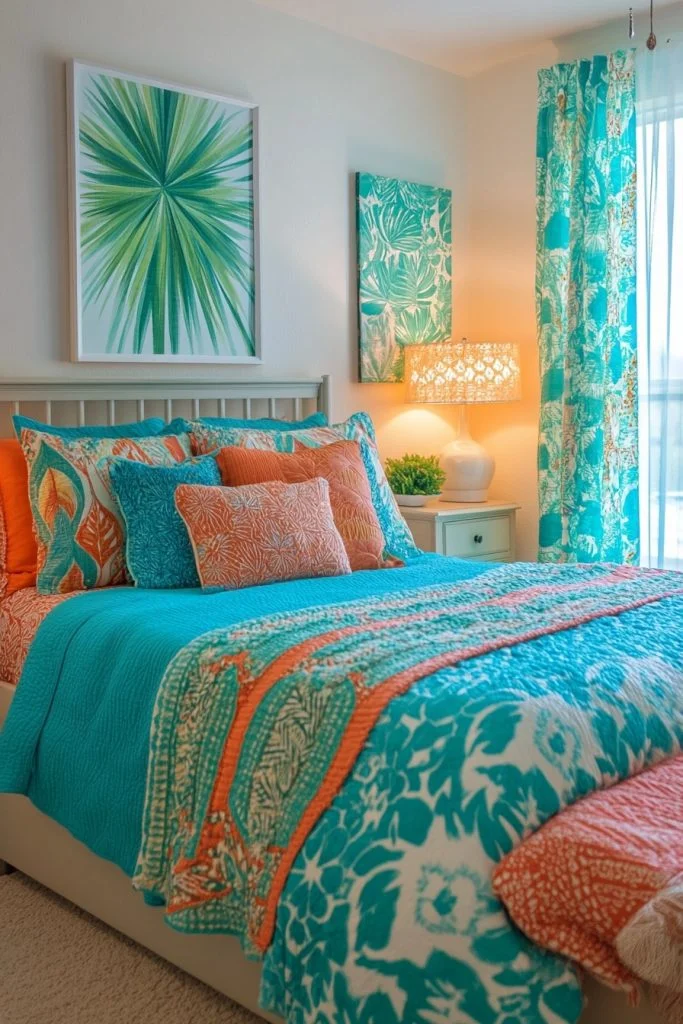 Tropical Escape utilizes bright teals and aqua to infuse a boho bedroom with the vibrant energy of tropical waters. This color palette can transform a bedroom into a cheerful and invigorating retreat. Pair these vivid colors with white or light wood furniture to maintain a light, beachy feel. Decorative elements like coral prints or bamboo frames can enhance the tropical atmosphere, making you feel like you’re on a permanent vacation.