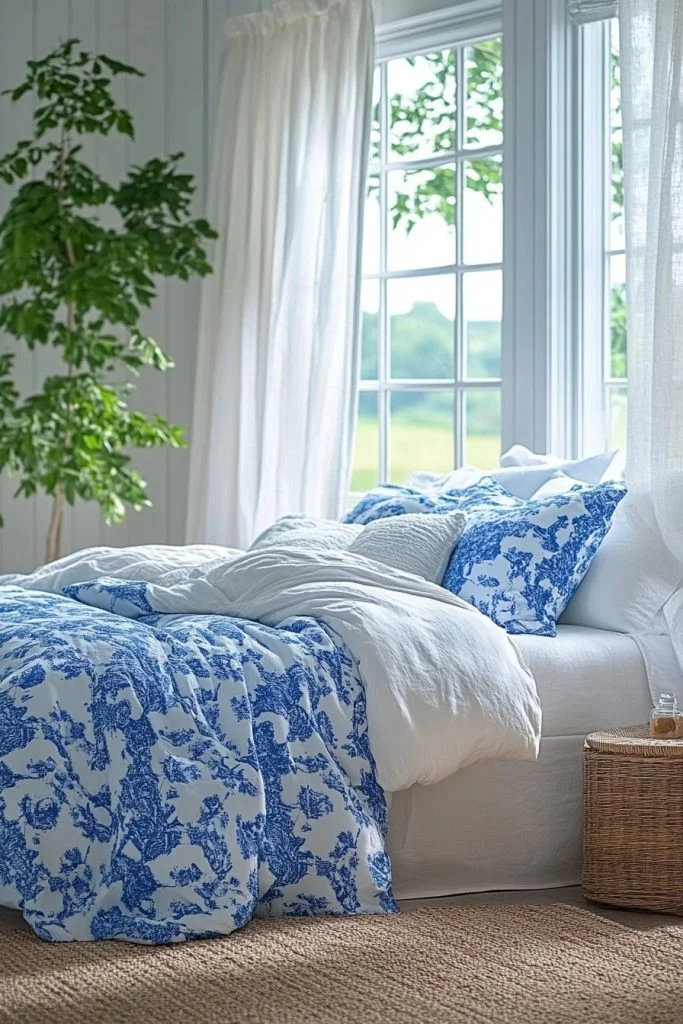 Coastal Cool combines navy blue and soft white to evoke the crisp, clean feel of a coastal boho bedroom. This palette is perfect for creating a serene, nautical-inspired space that feels both fresh and tranquil. Striped patterns and natural fibers like cotton or jute can add a maritime touch without resorting to clichéd decor. Pale wood and glass accents can keep the space light and airy, enhancing the refreshing vibe.