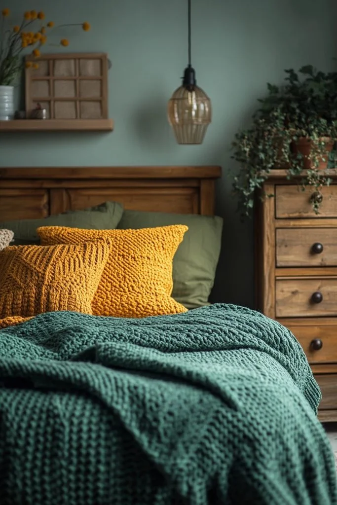 Autumn Whisper brings together olive greens and mustards, evoking the soft, muted tones of autumn in a boho bedroom. This warm, earthy palette is perfect for creating a cozy, inviting space that feels both grounded and serene. Textures like chunky knits and felt can add comfort and warmth, enhancing the autumnal vibe. Subdued lighting can highlight the richness of the colors, making the space feel more intimate and perfect for unwinding.