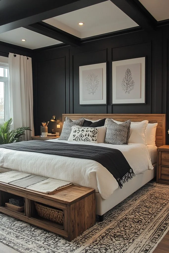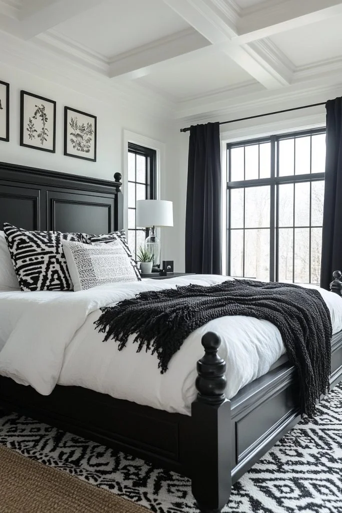 Monochrome Magic creates a bold and striking boho bedroom using only black and white. This palette is perfect for those who appreciate the dramatic contrast and visual impact of monochrome. Patterns play a key role in this style, with geometric or tribal prints adding complexity and interest. Minimalist furniture and decor can keep the space from feeling cluttered, while textured black or white textiles add warmth and depth.