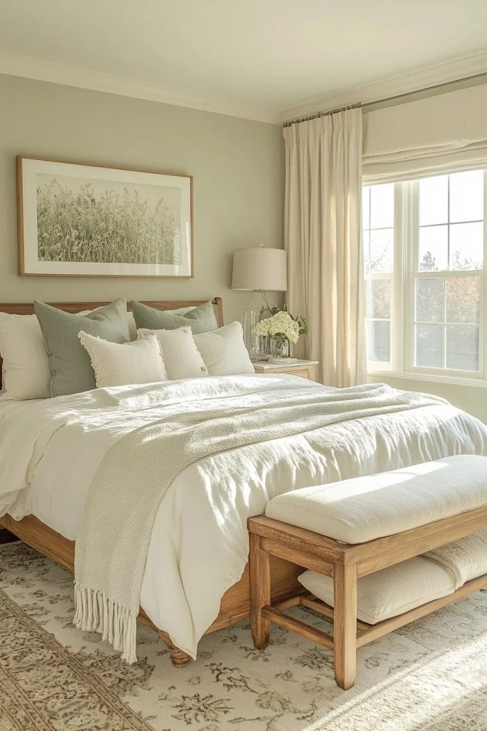 Tranquil Retreat uses sage green and dove gray to create a calm and balanced boho bedroom. This palette is perfect for those seeking a space that feels grounded and soothing. Natural materials like stone or unfinished wood can complement the earthy tones, enhancing the tranquil vibe. Soft, plush textiles in coordinating colors can add comfort and warmth, making the bedroom a true retreat for relaxation.