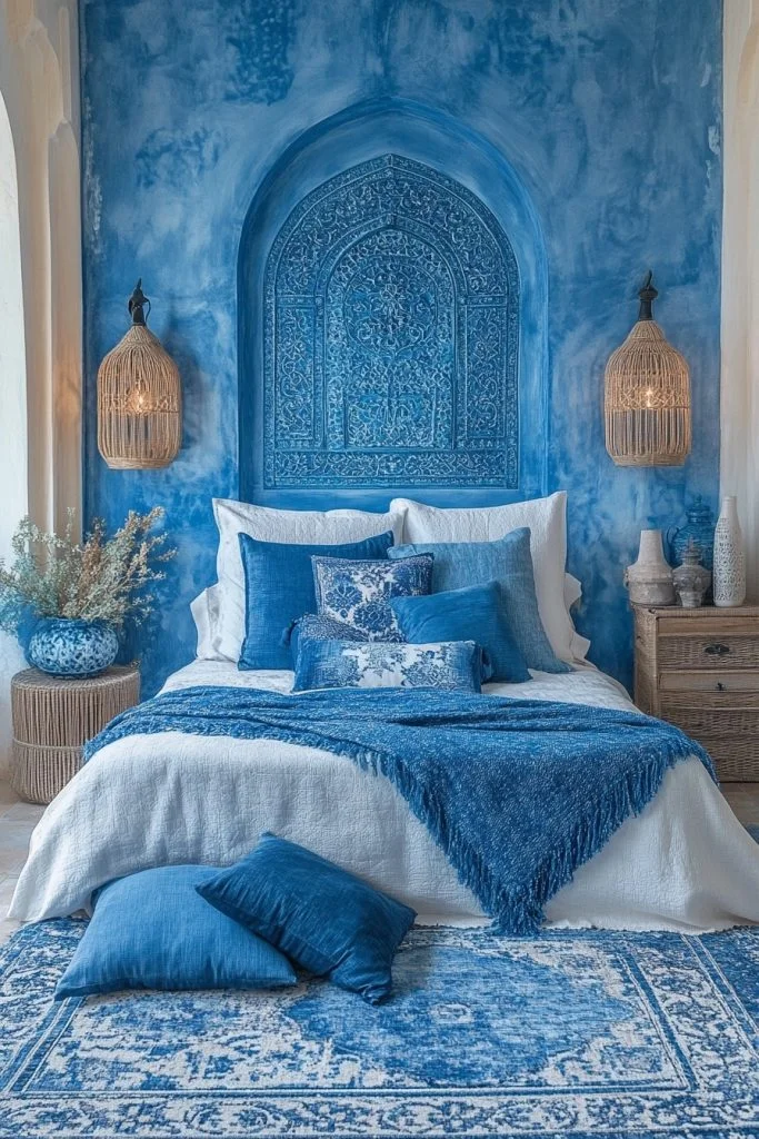 Bohemian Blues combines cobalt and cerulean to create a cool, calming boho bedroom. This palette is perfect for crafting a space that feels both serene and deeply reflective. Lighter shades of blue can be used in textiles and wall colors to maintain a light, airy feel, while darker blues add depth and focus. Natural materials like bleached wood or woven baskets can complement the blues, enhancing the bohemian feel.