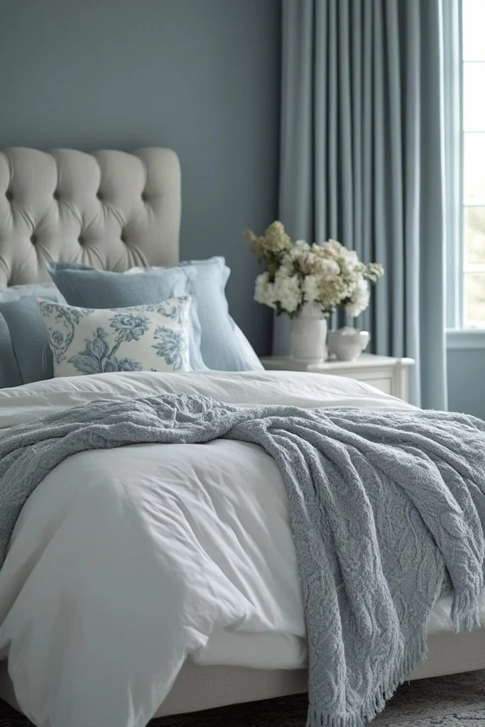 Ethereal Elegance uses soft gray and tranquil blue to craft a light, ethereal boho bedroom that feels like a peaceful sanctuary. This palette is perfect for creating a space that invites relaxation and contemplation. Light, flowing fabrics and delicate textures enhance the airy feel, while minimalist decor keeps the focus on the soothing colors. Subtle metallics or glass accents can add a touch of elegance without overpowering the serene vibe.