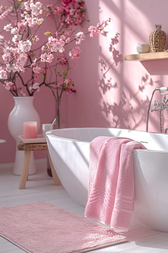 For those who prefer a space that feels energetic and alive, vibrant pink offers a bold solution that instantly invigorates the senses. This spirited approach involves using bright, saturated pinks that stand out confidently. It looks exceptionally striking when paired with modern fixtures and bright white surfaces, creating a high-contrast look that is undeniably stylish. You do not need to paint the whole room; simply using this shade for accents like plush towels, bath mats, or a statement vanity can wake up the room. This decor style is best suited for individuals who enjoy a touch of drama and want their interiors to reflect a lively personality.