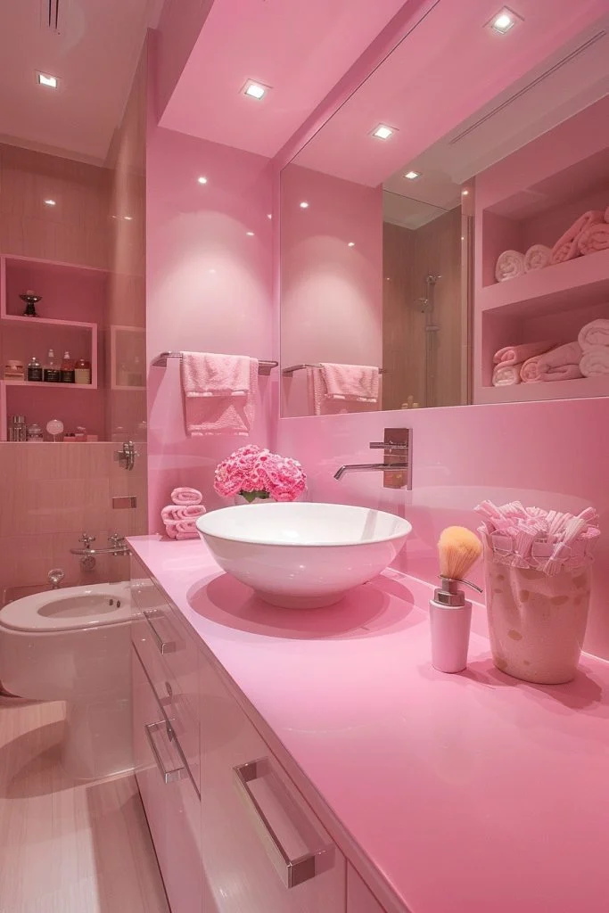 The Art Deco movement is synonymous with luxury, symmetry, and detailed craftsmanship, and pink adds a layer of feminine glamour to this grand style. A bathroom designed with an Art Deco theme might feature pink tiles arranged in angular, symmetrical patterns accented with metallic gold or silver. The color pink beautifully complements opulent materials often found in this style, such as marble countertops and brass fixtures. If you are looking to create a bathroom that feels timeless, luxurious, and dramatic, the Art Deco pink flair is a magnificent choice that exudes sophistication.
