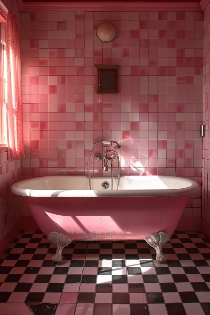 Drawing inspiration from the mid-century modern era, retro pink decor celebrates a time when pink tiles and fixtures were the height of fashion. To modernize this nostalgic look, combine pink elements with classic black and white checkered flooring or sleek metallic accents in chrome or brass. This style thrives on geometric shapes and glossy finishes that enhance the vintage vibe while keeping it polished. Retro pink bathroom decor is an excellent way to add a sense of nostalgia to your home while ensuring the overall aesthetic remains fresh, fashionable, and visually engaging for contemporary living.