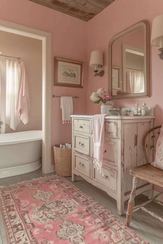 French country style combines rustic farmhouse elements with elegant, refined details, and pink is a wonderful addition to this charming decor theme. A bathroom designed in this style might include floral curtains, antique wooden furniture, and soft, warm lighting fixtures. The gentle use of pink enhances the romantic and bucolic feel of the bathroom, transporting you to a cottage in Provence. This style is ideal for those who love a vintage look that is sophisticated rather than shabby, offering a timeless appeal that feels lived-in and comfortable.