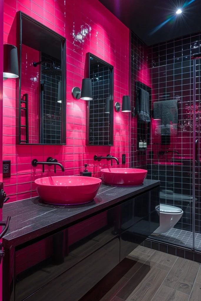 Neon pink brings a vibrant, electric, and playful energy to the bathroom that is unmatched by other shades. This bright hue is best used in small doses or specific accents to energize the space without completely overwhelming it. Pairing neon pink with neutral shades like white or gray keeps the look balanced and prevents it from becoming chaotic. Neon pink bathroom decor is perfect for adding a touch of fun and youthfulness to the home. This style is particularly great for kids’ bathrooms or creative spaces where high energy and joy are the main goals.
