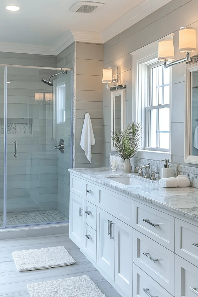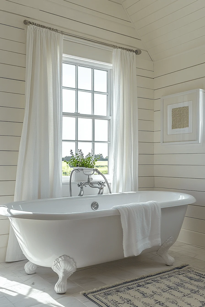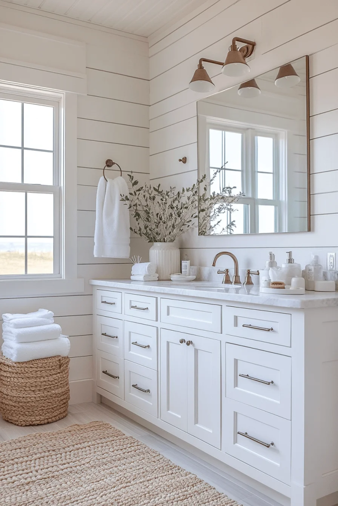 Shiplap Charm features shiplap walls for a touch of rustic texture. Painted in white or light blue, shiplap adds depth and interest to the space. Vintage-style fixtures in bronze or copper can complement the rustic feel. Soft, fluffy towels and a woven rug add comfort and warmth, making the bathroom feel like a cozy cottage nook.