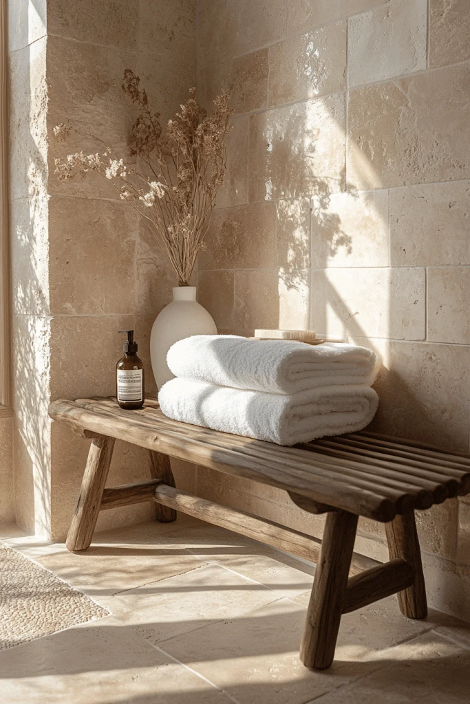 Sandy Beige Sanctuary features a warm beige and soft textures that mimic the beach. Tumbled stone tiles in sandy tones provide a natural, textured floor that feels soft underfoot. White or pastel linens add a light, airy touch to the room. Wooden accents, like a teak shower bench or bamboo shades, enhance the earthy feel, creating a spa-like retreat.