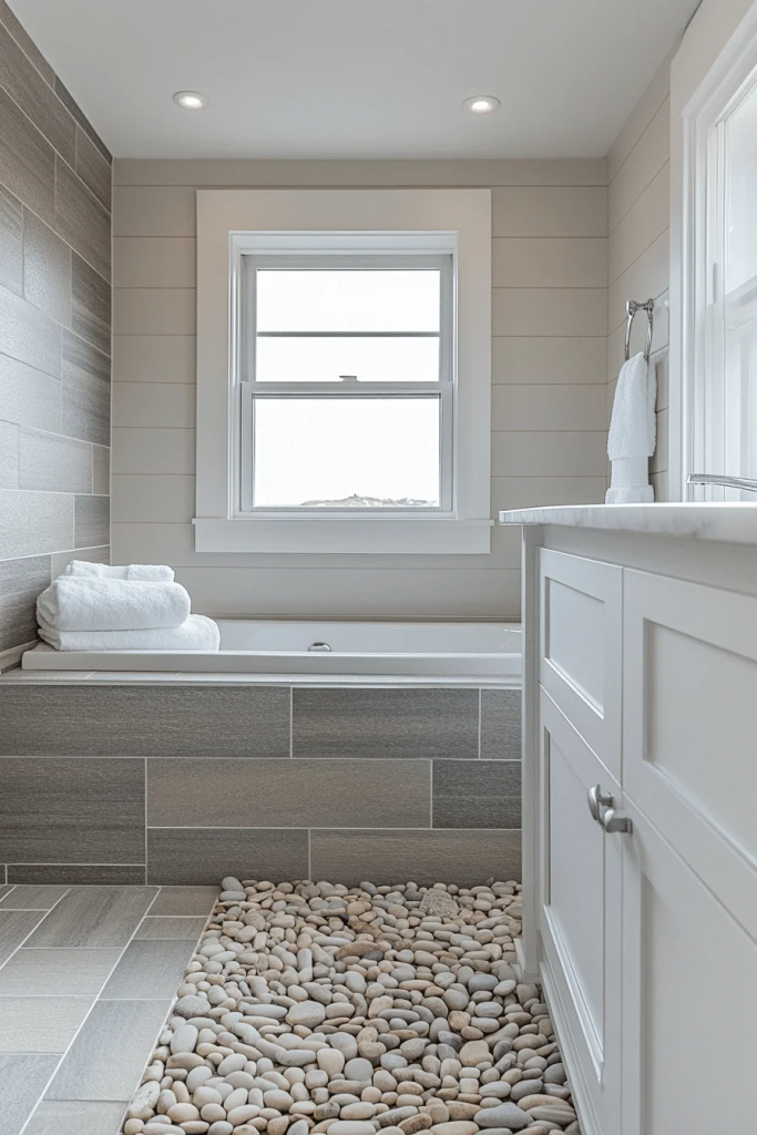 Coastal Minimalism focuses on uncluttered spaces and minimal color use to highlight natural beauty. Neutral tones, like soft grays and whites, create a calm, soothing palette. Textures play a key role, with elements like pebble tiles bringing a touch of nature indoors. Fixtures and decor are kept simple and functional, emphasizing quality and craftsmanship over quantity.