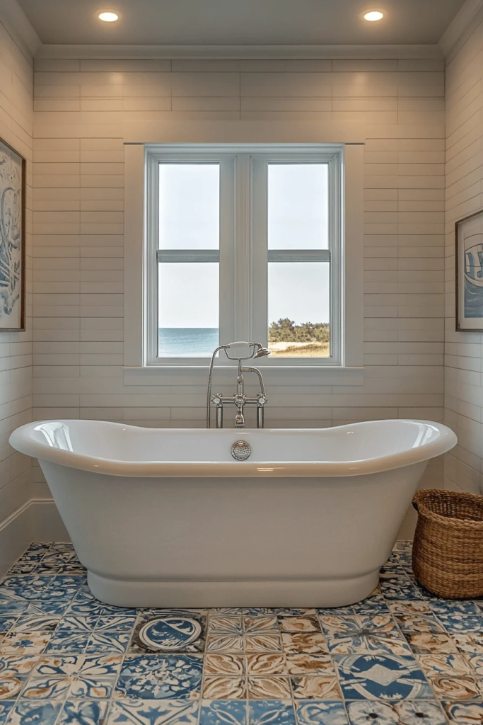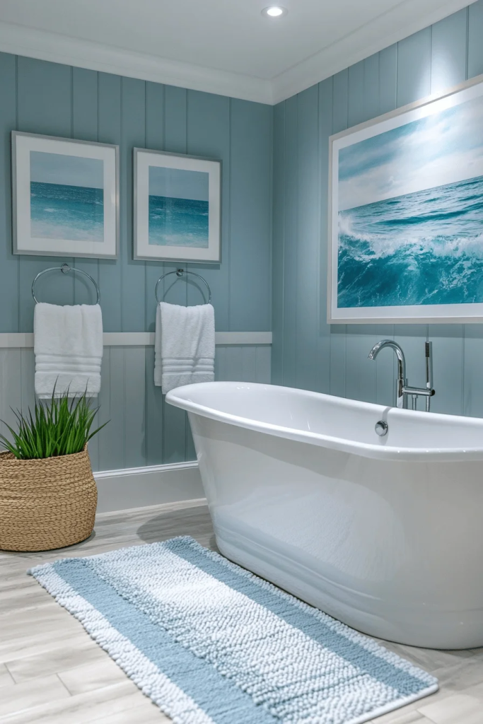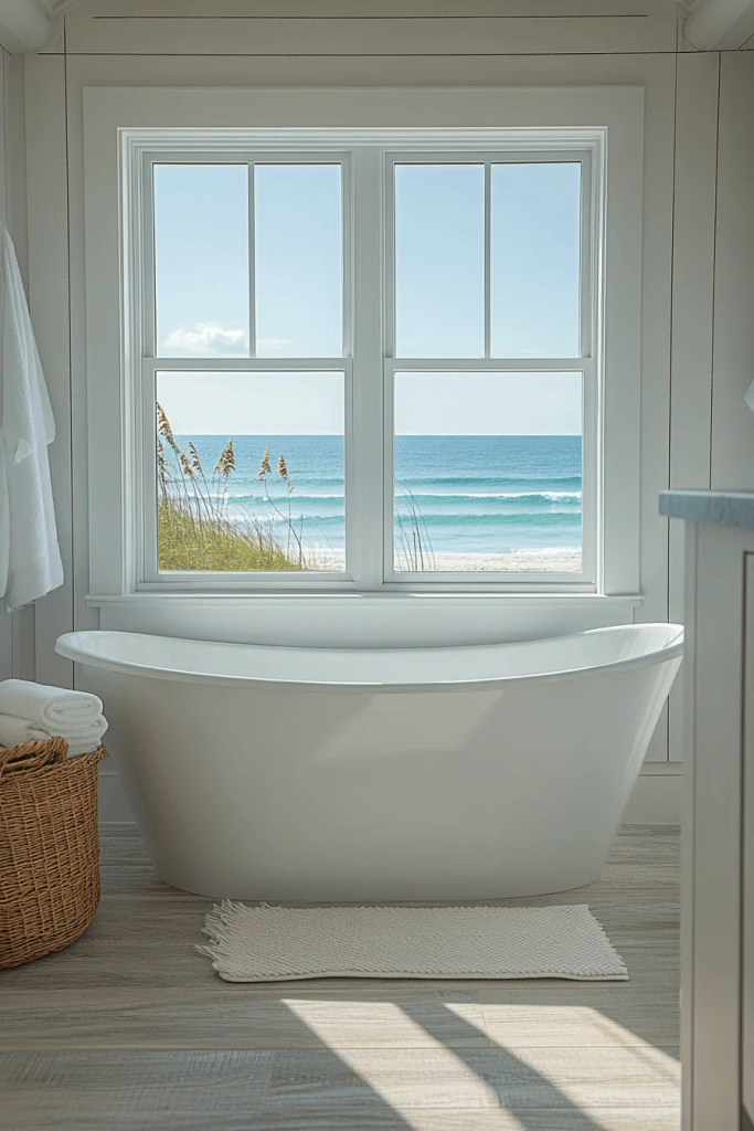 Seaside Spa Retreat combines elements of a spa with coastal charm. Soft blues and greens mimic the colors of the sea, creating a therapeutic backdrop. Features like a freestanding tub or a rain showerhead enhance the spa-like experience. Natural materials such as bamboo towels and a wooden bath mat add an organic touch that feels luxurious and grounding.