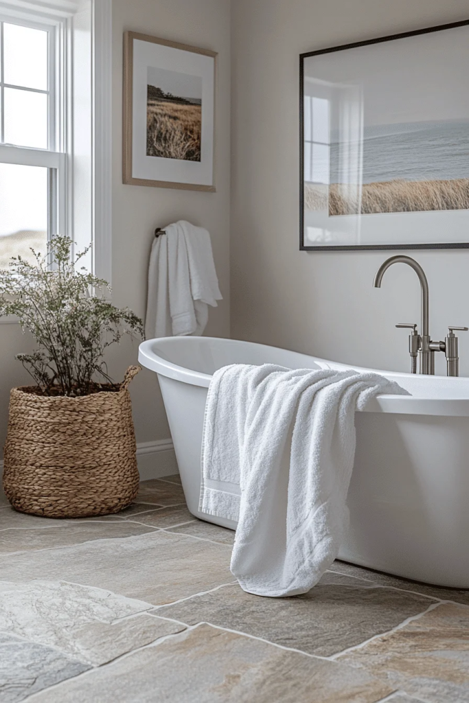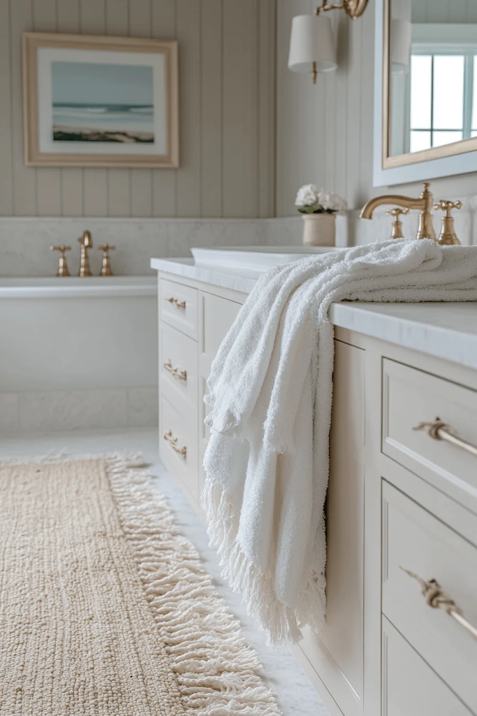 Soft Sand Elegance uses pale sand colors to create a soft, welcoming space. Plush white towels and an off-white area rug add luxurious touches. The use of smooth stones and beach glass as decor elements brings the coastal environment indoors. Elegant fixtures in brushed nickel or soft gold add a hint of sophistication to the relaxed palette.