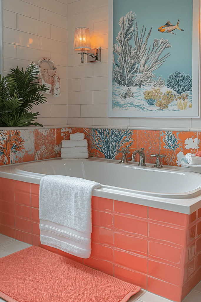 Coral Reef Color Pop uses vibrant coral shades as accent colors against a neutral backdrop. This pop of color energizes the space and pairs beautifully with white or grey. Decorative tiles with coral or ocean motifs can be used as a focal point. Accessories in matching tones, like towels and bath mats, complete the look with a cheerful burst of energy.