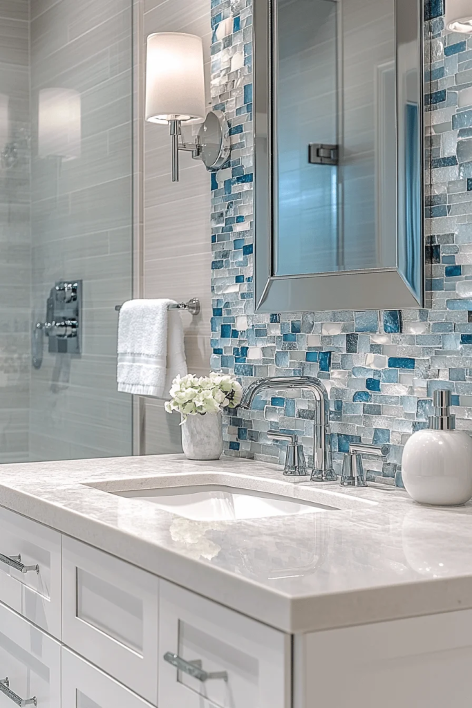 Sea Glass Touches incorporate sea glass as a decorative feature in tiles, mirrors, or light fixtures. This adds a subtle hint of color and texture that mimics the ocean’s treasures. The rest of the decor remains neutral, with clean lines and minimal fuss. Glass elements can be paired with chrome or stainless steel fixtures to maintain a modern, shimmering feel.