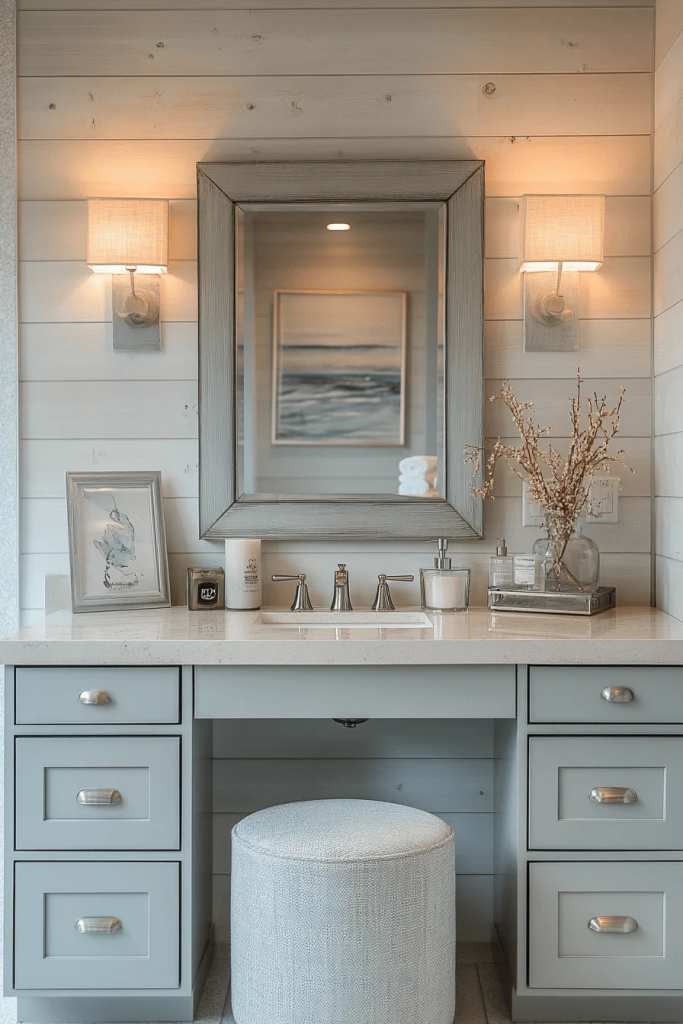 Seashell Simplicity emphasizes natural textures and colors of the beach. Walls adorned with seashell and sand-inspired hues create a soothing environment. This style often includes a seashell mirror frame or artwork, tying the seaside theme together. The use of natural materials like stone and wood complements the soft palette, grounding the airy feel with organic warmth.
