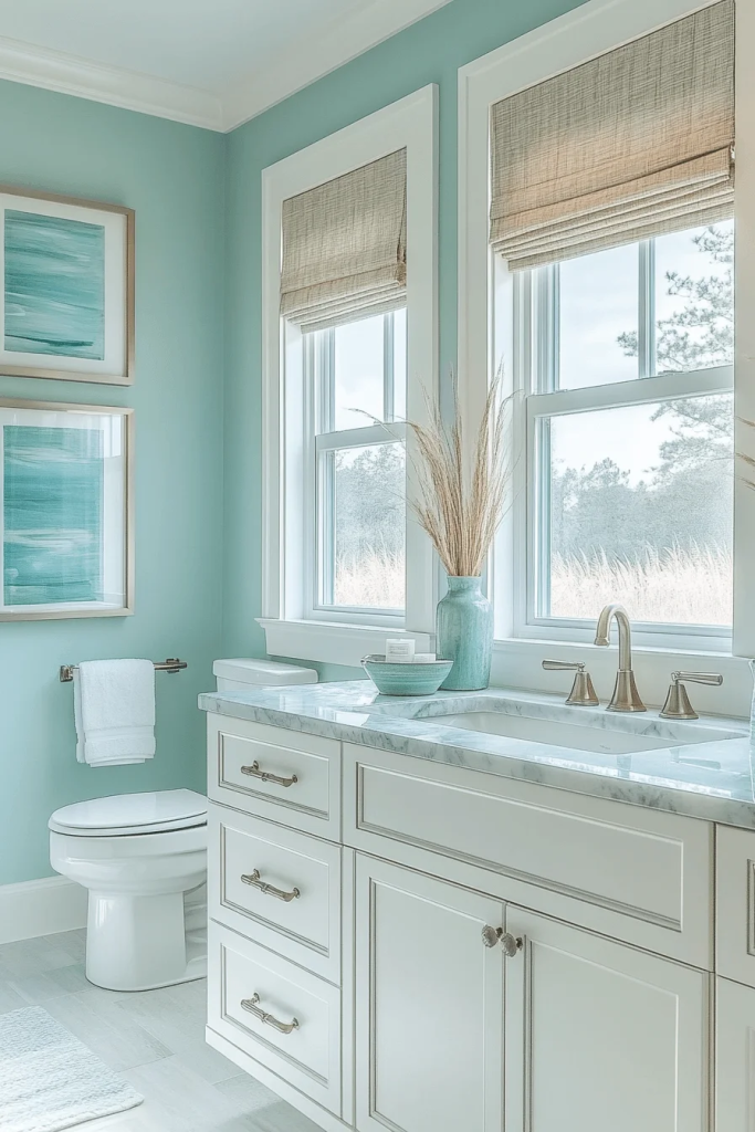 Sea Breeze Blue bathrooms are painted in various shades of blue to create a soothing, immersive environment. From sky blue to turquoise, the use of blue in tiles, walls, and decor mimics the ocean’s many hues. White accents, like moldings and linens, provide contrast and prevent the blue from overwhelming. This style is perfect for a refreshing experience.